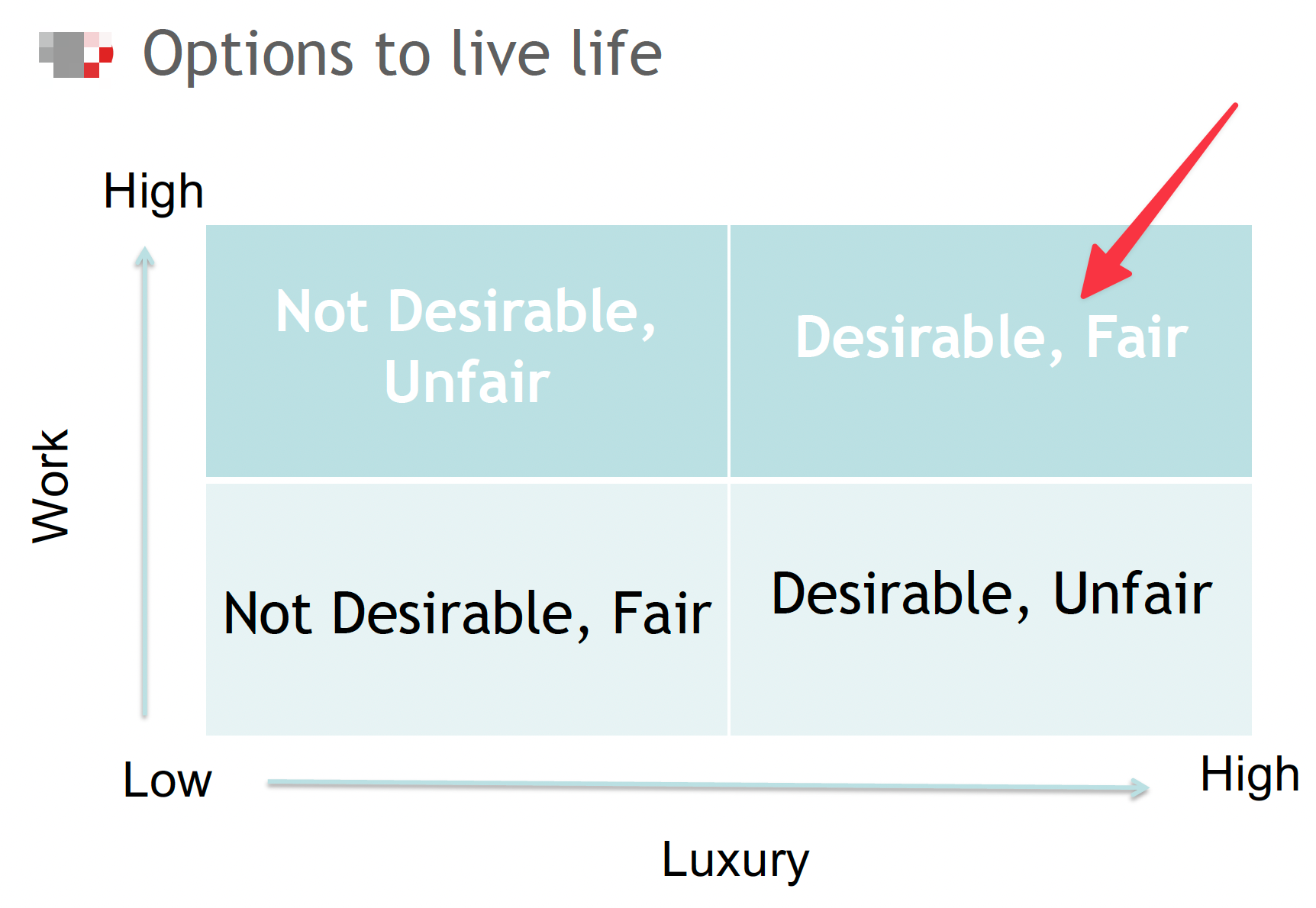 - Work: this is the second most important sphere of your life. This is what defines who you are. This is what enables you to start a family and also be respected by society. Think about it. Will your own family respect you if you do not take whatever it is that you do seriously? It is not about how much you earn, but about the discipline and dedication with which you carry out whatever work that you undertake. It does not mean that you have to stick to the same job or career forever, but whatever it is that you are currently doing in your career, it must be done with utmost sincerity and dedication. Here is a picture that I drew a couple of years ago and decided that I want to be in the top-right quadrant
